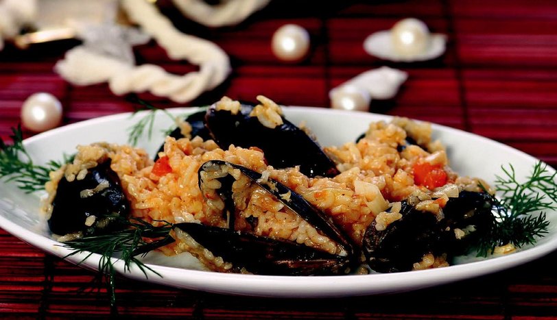 Soğanları zeytinyağında pembeleşene kadar kavurun. İçine domates, sarımsak katıp kavurmaya devam edin. Midye, pirinç, tuz, karabiber ve su ilave edip karıştırdıktan sonra kısık ateşte 15-20 dakika pişirin. Sıcak olarak servis yapın.