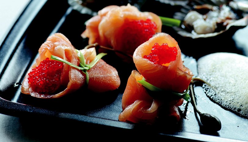 Deniz taraklarını su dolu tencerede haşlayıp, kepçe yardımıyla çıkarın. Somon fümeleri ortaları boş kalacak şekilde rulo yapın. Maydanoz saplarıyla ortalarından bağlayın.