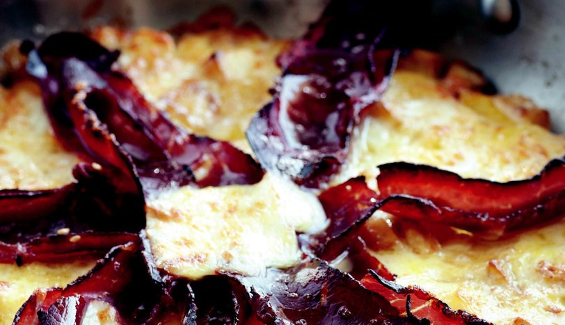 Üzerine çırpılmış yumurtaları ekleyin, tuz, karabiber katıp, tavanın ağzını bir kapakla örterek, pişmeye bırakın. Yumurtalar pişince üzerine kaşar peyniri serpin ve pastırma dilimlerini yerleştirin. Tekrar kapağı kapatıp, 1-2 dakika daha pişirdikten sonra sıcak servis yapın.