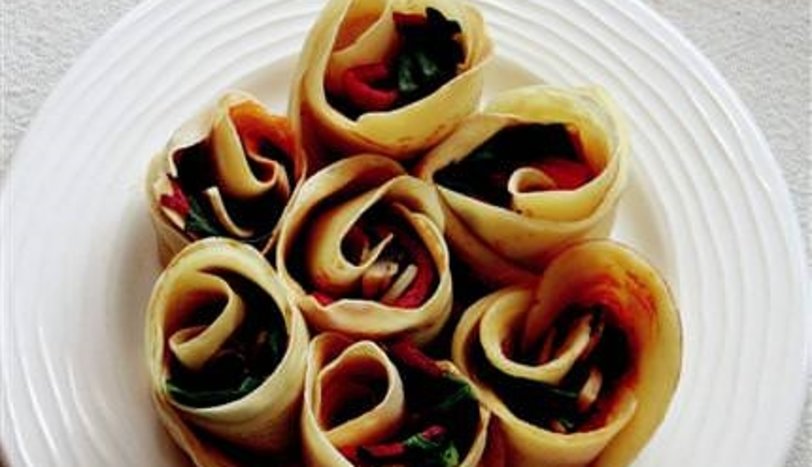 1 adet közlenmiş kırmızı biber ve ıspanakları kreplerin üzerine yerleştirin. Krepleri rulo yapın ve ikiye keserek tabağa yerleştirin. Kalan kreplere de aynı işlemi uygulayıp, servis yapın.