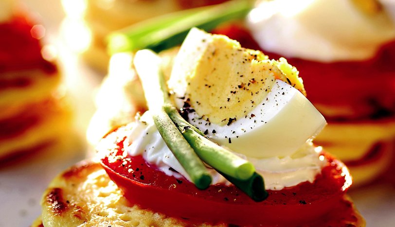 Pancake'leri iki ya da üç kat olacak şeklide servis tabağına yerleştirin. Üzerlerine biber dilim domates koyun. Labne peynirini sıkma torbasına alıp, domateslerin üzerine sıkın. Haşladığınız yumurtaları arzunuza göre dilimleyin ve labne peynirinin üzerine yerleştirin. Tuz ve karabiber serpin. Taze soğanla süsleyerek servis yapın.