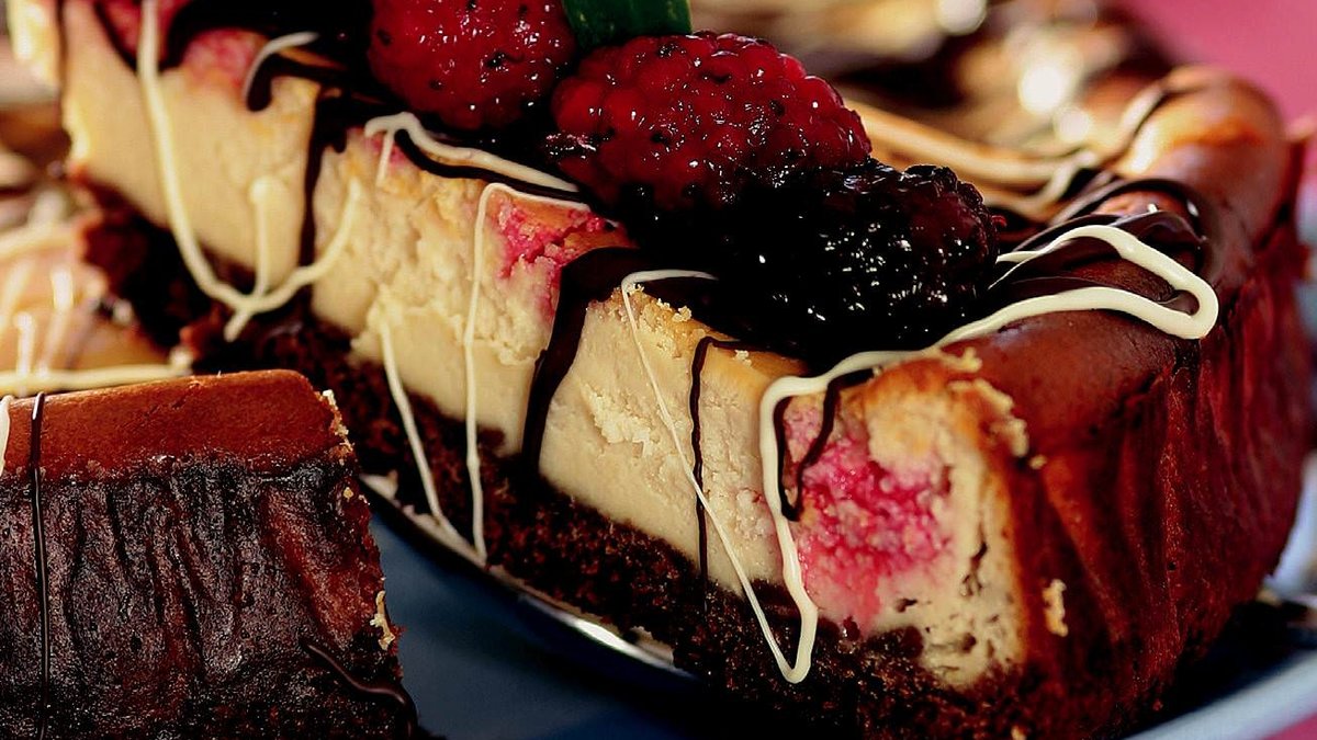 Fırın ayarını değiştirmeden 1 saat pişirin. Kelepçeli kalıptan çıkarıp servis tabağına alın. Eritilmiş bitter ve beyaz çikolata ile süsleyin. Dilimleyerek, arzunuza göre böğürtlenle süsleyerek servis yapın.