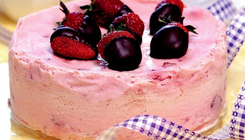 Buzdolabının alt rafına yerleştirip 35-40 dakika, hafif kıvam alana dek dinlendirin. Buzdolabından alın ve üzerine ikinci kağıt helvayı yerleştirip, kalan karışımı yayın. İyice donana dek buzdolabında dinlendirin. Çilekle süsleyip, soğuk olarak servis yapın.