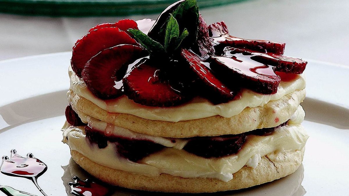 Sapları ayıklanmış küçük boy çilekleri aralıksız dizin. Üzerine toz şeker ile çırpılmış krem şantiyi bir paletle yayın. Diğer mereng ile krem şantinin üzerini kapatın. Merengin üzerine önce krem patisserie, daha sonra krem şanti sürün.