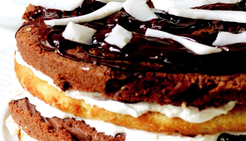 Karışımı kalıba yayın. Aynı işlemi siyah kek için de uygulayın. Kekleri kalıptan çıkarıp soğutun. Enlemesine ikiye ayırın. Kremayı buzdolabında soğutun. Şeker ve hindistan cevizi ekleyip karıştırın. Koyu renk keklerden birini servis tabağına alıp üzerine krema sürün. Üzerine beyaz kek yerleştirip tekrar krema sürün. Kalan siyah keki yerleştirip krema sürün.- 3