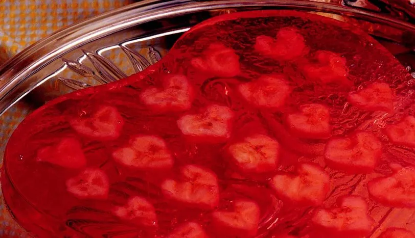 Çilek jölesini bir buçuk su bardağı sıcak suda eritin. Üzerine bir buçuk su bardağı soğuk su dökün. Hazırladığınız jöleyi, kalp şeklinde bir kalıbın yarısına kadar doldurun. Buzdolabına koyup, dondurun. Muzu kalp şeklinde dilimleyin ve kararmaması için limon suyu damlatın. Jöleyi dolaptan çıkarıp, üzerine muz dilimlerini dizin. Kalan jöleyi de üzerine ekleyin. Tekrar dolaba koyun. Donunca dolaptan çıkarın. Servis tabağına ters çevirip, çıkarın.AŞÇININ NOTUJöleyi kalıptan çıkarmakta zorluk çekiyorsanız, kalıbı birkaç dakika hafif ateşte tutun.