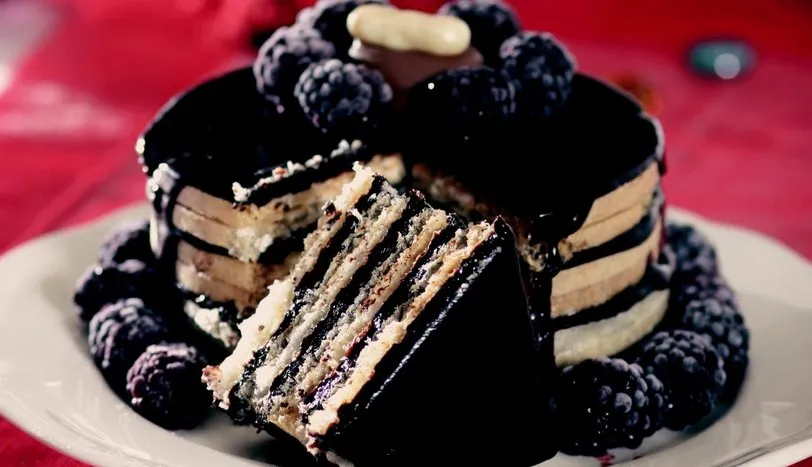 Çikolata, tahin helvası ve tereyağını aynı kap içinde benmari usulü eritin. Ocaktan almaya yakın kakao ve kremayı ilave ederek karıştırın. Kağıt helvaların bütün katlarına harçtan sürerek ceviz içi serpiştirin ve üst üste koyun. Pastanın tamamını harçla kaplayarak böğürtlen veya vişneyle süsleyin. Harç iyice sertleşene dek oda sıcaklığında dinlendirin. Dilimleyerek servis yapın.AŞÇININ NOTUBu pastayı büyük boy kağıt helva ile de hazırlayabilirsiniz. 4 adet büyük boy kağıt helva için malzeme miktarını 2 katına çıkartmanız yeterli.
