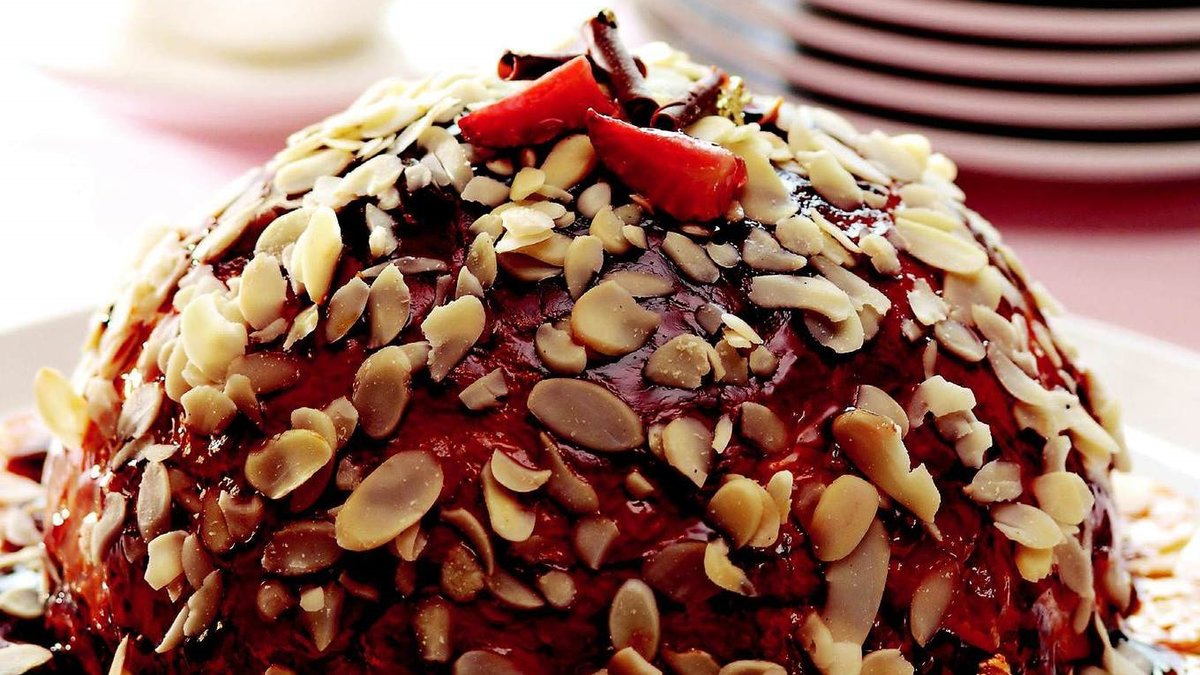 Yaprak jelatini 2 yemek kaşığı soğuk suda eritip, ekleyin. Karışımın yarısını yuvarlak kek kalıbına dökün. Üzerine file badem serpiştirin. Kalan karışımı üzerine dökün. Bisküvi yerleştirip, derin dondurucuda (-18 derece) donana dek dinlendirin.
