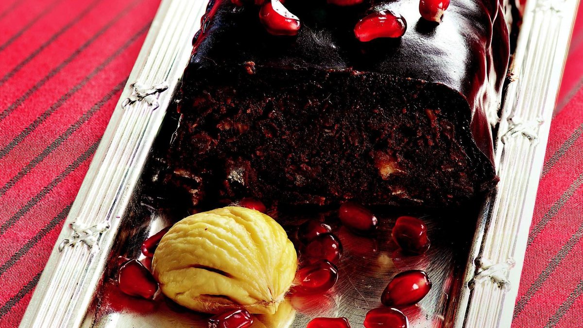 Pastayı kalıptan çıkartın ve servis tabağına alın. Üzeri için çikolata, tereyağı ve kremayı benmari usulü eritip, ılıtın. Bu karışımı spatula ile pastanın üst ve kenar kısımlarına eşit miktarda sürün. Buzdolabında en az yarım saat beklettikten sonra üzerini kestane, nar tanesi ve beyaz çikolata ile süsleyip, servis yapın.