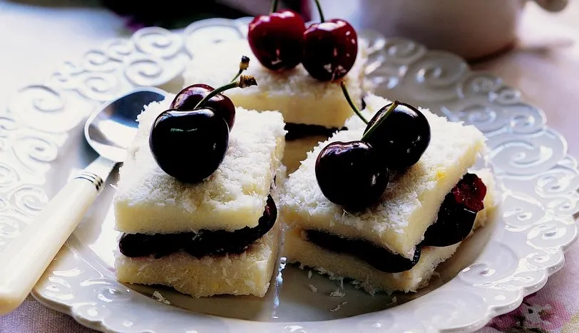 Sütü bir tencereye alıp ocağa oturtun. Ilınınca toz şeker ve irmiği ekleyip, karıştırarak muhallebi kıvamına gelene kadar pişirin. Ocaktan almadan önce rendelenmiş limon kabuğunu ekleyip karıştırın. Ocaktan alın. 20x30 cm ebatında bir tepsiye hindistancevizini serpin. Üzerine kremayı yayıp düzleyin. Buzdolabında soğutun. Çıkarıp 3x4 ebatlı dikdörtgenler kesin. Kirazların çekirdeklerini çıkarıp, minik minik doğrayın. Dikdörtgenlerin yarısının üzerine kirazlardan koyun. Kalan dikdörtgenleri kapak olarak yerleştirin. Üzerini süsleyip, soğuk servis yapın.