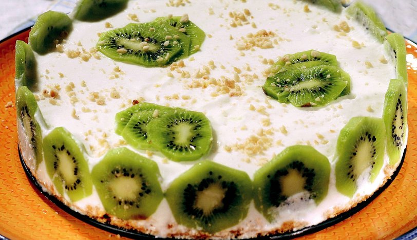 Yağı eritip, bisküvileri mutfak robotunda ufalayın. Ufalanmış bisküviyi yağla iyice karıştırın. Kelepçeli kek kalıbının tabanına bisküvili karışımı elinizle bastırarak döşeyin. İnce dilimler halinde kesilmiş kivileri kelepçeli kalıbın kenarlarına dizin. Toz jelatini 3 yemek kaşığı kaynar suda eritin.