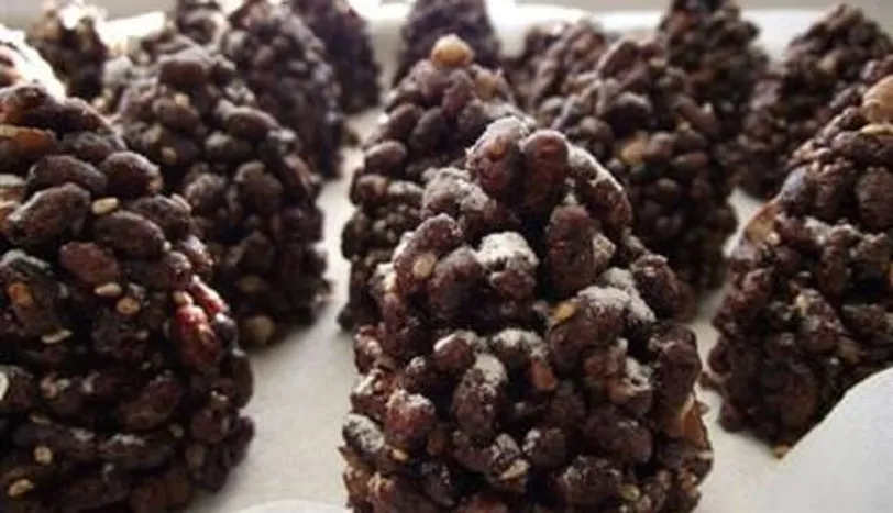 Bu miktarlarla yaparsanız 26 adet kozalak çıkıyor eger size fazla geldiyse oranları düşürebilirsiniz.İlk önce susamı hiç yag koymadığımız teflon tavaya alıp rengi dönene kadar kavuruyoruz.Sonra ılınmaya bırakıyoruz.Ayrı bir yerde tereyağı,kakaoyu,pudra şekerini kısık ateşte pişiriyoruz.Ocaktan indirdikten sonra içine pirinç patlağını,susamı,balı ve cevizi ekliyoruz.Evde kullandığınız plastik ve üstü çıkabilen limonluğun arka kısmını hafif sıvı yağ ile yağlıyoruz ve karışımdan bir miktar koyuyoruz.Şeklini aldıktan sonra çıkarıyor ve tepsiye diziyoruz.Üstüne soğuduktan sonra pudra şekeri serpiyoruz.