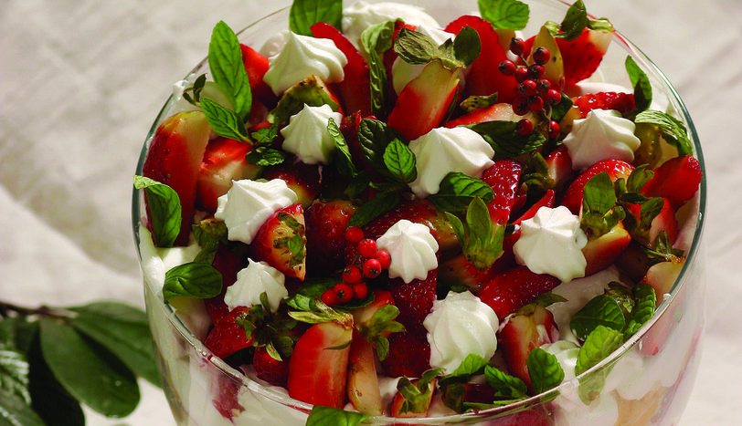 Üzerine badem veya fındıkları serpin. Sütü iyice çeken bisküvileri büyük cam kaseye bir sıra dizin. Üzerine soğumuş kremadan dökün. Dilimlenmiş çileklerden dizin. Malzemeler bitene dek ve en üstüne çilekler gelecek şekilde bu işlemi tekrarlayın. Nane yapraklarıyla süsleyip 20 dakika buzdolabında bekletin. Dilimleyerek servis yapın.