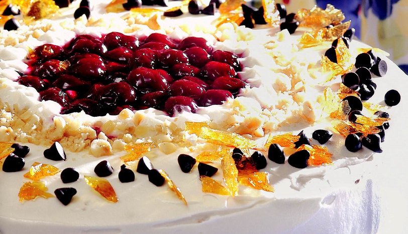 Soğuyunca karameli kırıp, kekin üzerine serpin. Diğer keki kremanın üzerine kapatın. Diğer tarafta soğuk süt ve toz krem şantiyi çırpın. Pastanın her tarafını krem şanti ile kaplayın. Üzerini dondurulmuş vişne ve çikolata parçalarıyla süsleyerek buzdolabında 1 saat bekletin. Dilimleyerek servis yapın.