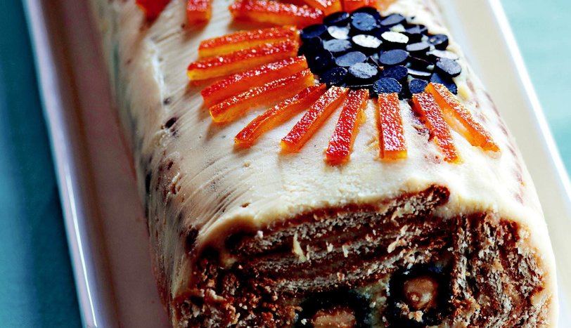 Servis yapmadan 2 saat önce buzluktan çıkarıp, üzerini damla çikolata - portakal şekerlemesi ile süsleyin. Dilimleyerek servis yapın.