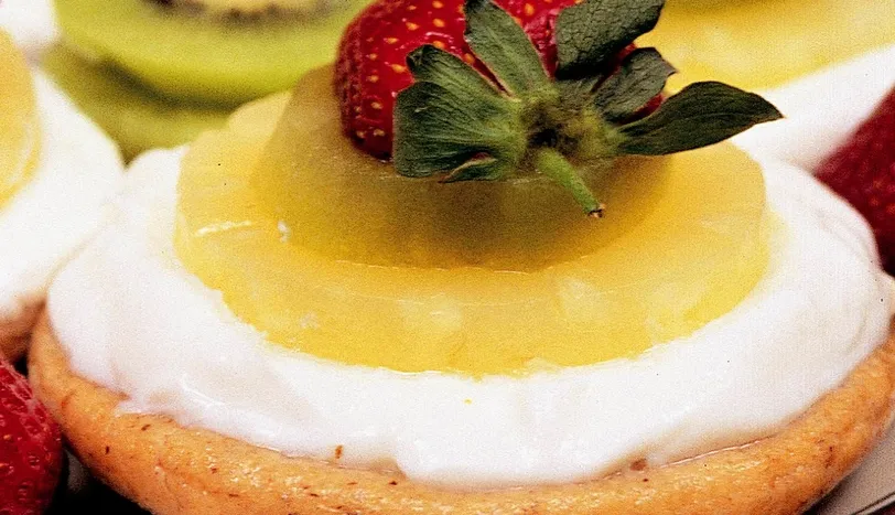 Konserve ananasın suyunu derin bir kaba alın. Acıbademleri ananas suyunda yumuşayana kadar bekletin. Sonra servis tabağına alın. Başka bir kapta 1 paket toz krem şantiyi süt ile çırparak kıvamlı bir hale getirin. Krem şantiyi acıbademlerin üzerine paylaştırın. Üzerine sırayla bir dilim ananas, bir dilim kivi ve 1 adet çilek yerleştirerek servis yapın.