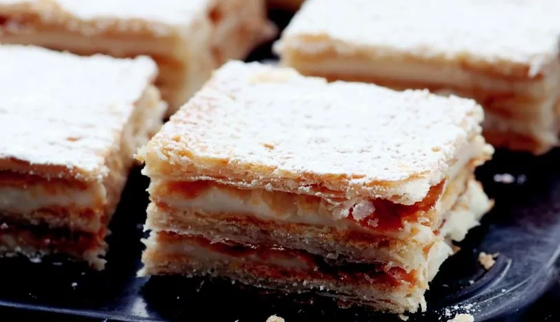 açıp, hamuru tekrar katlayın ve dolaba koyun, beklemeye bırakın. Bu işlemi 4-5 kez tekrarlayın. Her seferinde margarinle açın. Sonuncuda hamuru dolaptan alıp, tekrar margarinle tepsi büyüklüğünde açın. Kenarlarını ruletle düzeltin. 180 derece fırında üzeri hafif pembeleşene dek pişirin. Bu arada vanilya ve margarin hariç krema malzemesini ocağa alıp muhallebi kıvamına gelene dek pişirin. Ocaktan alınca margarin ve vanilyayı ekleyip karıştırın. Fırından aldığınız hamuru testere bıçakla enlemesine üçe bölün. Üzerine kremayı sürün. Diğer milföy hamurunu üzerine kapatın. Tekrar testere bıçakla dilediğiniz büyüklükte dilimleyin. Üzerine pudra şekeri serperek servis yapın.