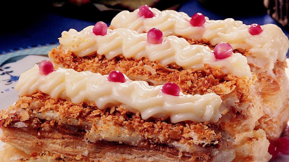 Milföy parçalarının aralarına hazırladığınız kremayı sürerek, 3 milföy parçasını üst üste yerleştirin. Kremayı, milföy parçalarının üstüne sürün. Kırıntıyı kremanın üzerine serpin. Kalan kremayı, krema sıkacağı ile pastacıkların üzerine sıkın. Nar taneleri ile süsleyip servis yapın.