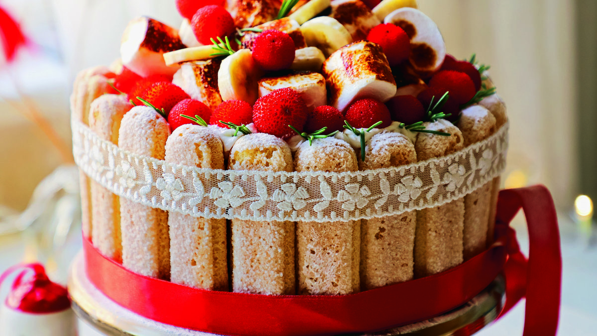 Buzdolabından çıkardığınız pastanın kelepçeli kalıbını açın. Kedi dillerinin etrafından şık bir kurdele bağlayın. Üzerine marshmallow, çilek ve muz dilimleri koyun. Pudra şekeri serpip servis yapın.