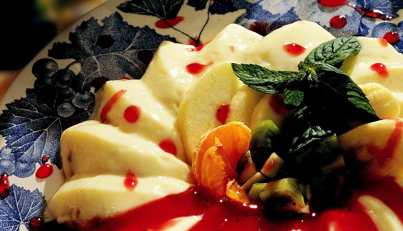 Buzdolabında 3 saat beklettikten sonra servis tabağına ters çevirip çıkarın. Üzerine meyveli sosu gezdirin. Küp doğranmış meyvelerle süsleyip, servis yapın.