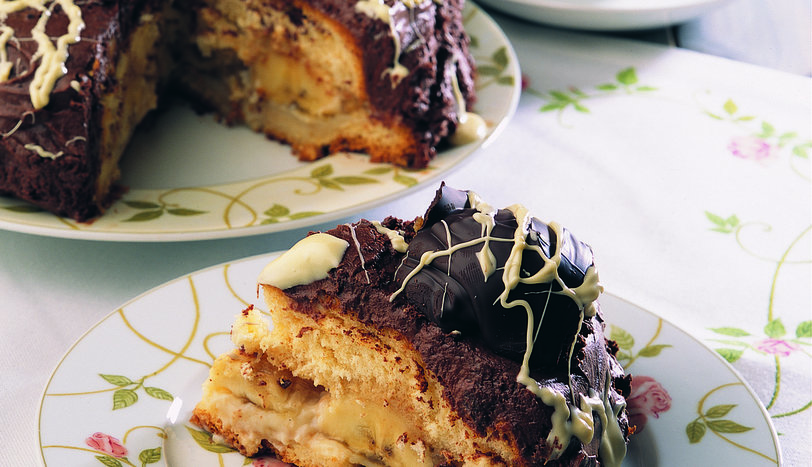 İkinci keki de üstüne yerleştirin. Kalan kremayı sürüp donmaya bırakın. Çikolatayı benmari usulü eritip karıştırarak soğutun. Çikolatayı kremayla karıştırın. Pastanın üzerini çikolatalı kremayla sıvayın.