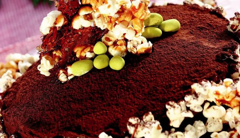 Öncelikle kremayı hazırlayın. Bunun için, bir tencereye süt, toz şeker, un, yumurta sarısı ve kakaoyu alıp iyice çırpın. Ocağa oturtup sürekli karıştırarak koyulaşana kadar pişirin. Altını kapattıktan sonra tereyağı ve vanilya ilave edin. Karıştırıp soğumaya bırakın. Toz şekeri süte ekleyip eritin. Pandispanyanın her iki parçasını da sütle ıslatın. Alt parçayı bir tabağa alın. Kremanın yarısını pandispanyanın üzerine dökün. Kekin üst parçasını yerleştirin. Kalan kremayı üzerine döküp her tarafını kaplayın ve buzdolabında 3- 4 saat bekletin. Patlamış mısırı hazırlamak için, geniş bir tencereye 1 çorba kaşığı zeytinyağını alın. Üzerine 2-3 adet mısır tanesi ekleyin ve kapağı kapalı olarak ocağa oturtun. Mısırlar patlayınca kalan mısırı tencereye döküp kapağını kapatın. Arada bir tencereyi sallayarak mısırı patlatın ve kenara alın. Karamel için, geniş bir tavaya toz şeker ve suyu alın. Orta ateşte 10-15 dakika pişirin. Şeker köpürüp kahverengine dönüşünce ocaktan alın. Patlayan mısırı tavaya ekleyip karıştırın. Soğuduktan sonra istediğiniz şekilde pastanızı süsleyin. Antep fıstıklı drajeleri de ekleyip servis yapın.