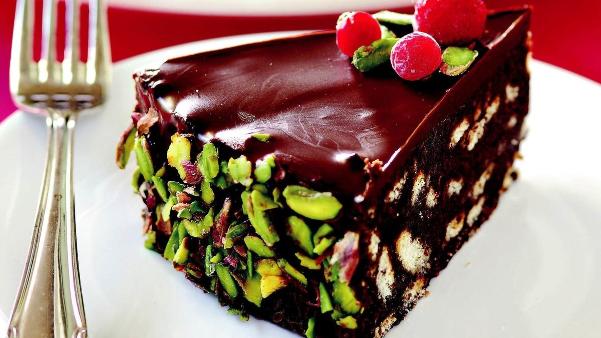 İyice yoğurup, yağlı kağıt serilmiş 18 cm çapında kelepçeli bir kalıba dökün ve elinizle bastırarak şekil verin. Buzdolabında en az 2-3 saat bekletin.Kelepçeli kalıptan servis tabağına çıkarın. Çikolata sosu üzerindeki tarife göre pişirip, ara sıra karıştırarak ılıtın ve tatlının üzerine dökün. Kenarlarına file Antep Fıstığı yapıştırıp servis yapın.