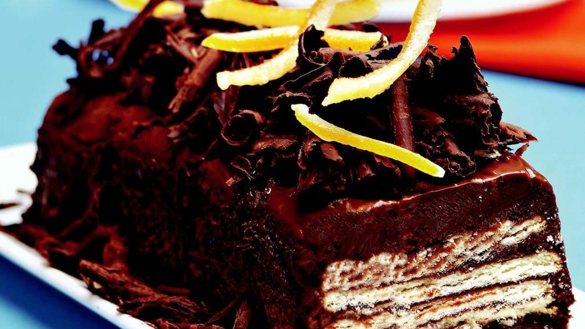 Ayrı bir yerde portakal suyu ile Grand marnier'i karıştırın. Bisküvileri bu karışıma batırıp çıkarın. Çikolatalı karışımın bir kısmını yağlı kağıtla kaplanmış baton kek kalıbına dökün. Üzerine bisküvi yerleştirin. Aynı işlemi 4-5 kez tekrarlayın. En üste çikolata döküp, pastanın her tarafına yayın.