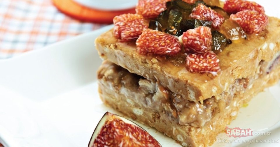 Bisküvili karışımı iki parçaya ayırın. Streç filmle kaplanmış orta boy kare bir kalıba elinizle bastırarak yayın. Sonra ters çevirip çıkarın. İkinci parçayı da bastırarak yayın. Üzerine pekmezli karışımı yerleştirin. Kalıptan çıkardığınız ilk bisküvili parçayı üzerine kapatın. Elinizle hafif bastırıp, derin dondurucuda sertleşene dek dinlendirin. Dilimledikten sonra incir ve incir reçeli ile süsleyerek servis yapın.
