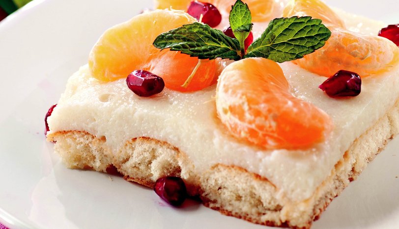 Üzerine sütlü karışımı boşaltın ve spatula ile düzeltin. Mandalina ve nar ile süsleyip, donması için buzdolabında en az 2 saat bekletin. Dilimleyerek, soğuk servis yapın.