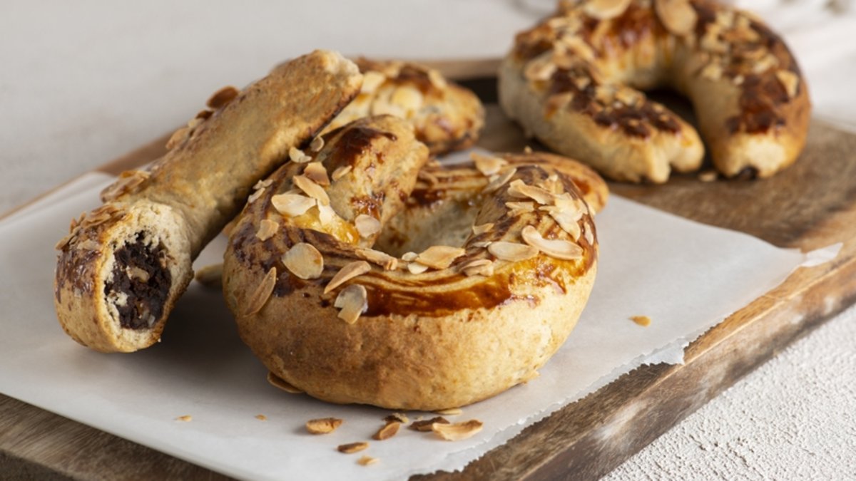 Pişirme kağıdı ile kaplanmış fırın tepsisine yerleştirip 15 dakika dinlendirin. Üzerine çırpılmış yumurta ve süt karışımını fırça yardımı ile sürün. Fındık içi serperek önceden ısıtılmış 180 derece fırında kızarıncaya kadar pişirin. Ilık veya soğuk olarak servis yapın.