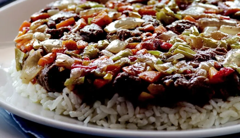 Pirinci ılık suda 1 saat bekletip süzün. Tereyağını bir tencereye alın ve pirinci ekleyin. Beyazlaşana dek kavurup, üzerini geçecek kadar sıcak su ve tuz ekleyin. Tencerenin kapağını kapatın. Su kaynayana dek orta, kaynadıktan sonra kısık ateşte suyunu tamamen çekene dek pişirin. Tencerenin üzerine kağıt havlu kapatıp 10-15 dakika demlenmeye bırakın. Diğer taraftan soğanları temizleyip yemeklikten biraz daha irice doğrayın. Havuç ve biberleri küp doğrayın. Eti bir tencereye alıp suyunu salıp yeniden çekinceye dek pişirin. Üzerine sıvı yağ soğan, havuç ve biberleri ilave edin. Kısık ateşte et yumuşayana dek pişirin. Ocaktan almadan hemen önce tuz ve karabiber ilave edin. Servis için, istediğiniz büyüklükte yuvarlak bir kaseyi hafifçe ıslatın. Dibine etli harçtan yerleştirin. Üzerine pilav koyup, bastırın. Kasenin üzerine servis tabağını kapatın. Ters çevirerek kasedeki pilavı tabağa aktarın ve servis yapın.