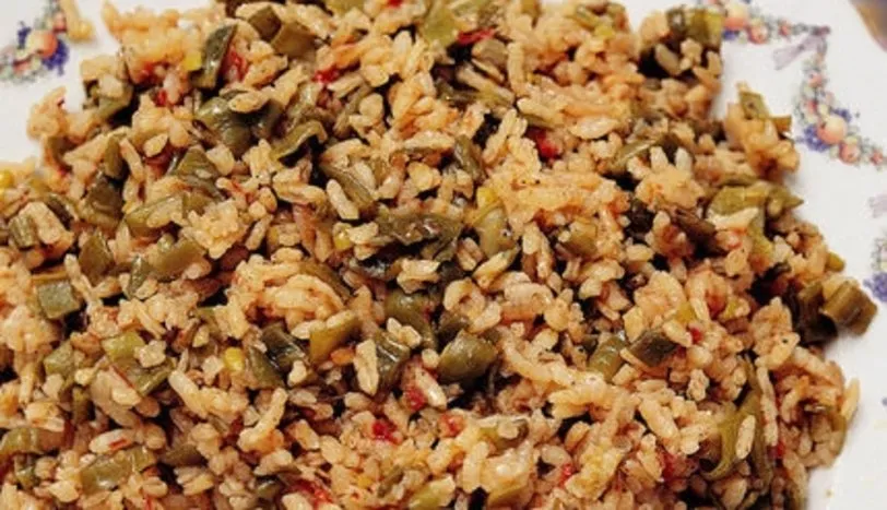 Soğanı sıvı yağda pembeleşene dek çevirin. Domatesi küp doğrayarak ekleyin. Fasulyeyi 1 cm eninde doğrayıp, tencereye alın. Kapağını kapatıp, kendi suyuyla pişirin. Kaynar su, tuz ve karabiberle birlikte pirincide tencereye alın. Kısık ateşte suyunu çekene kadar pişirin. Tereyağını eritip, hazırladığınız yemeğin üzerine gezdirin.