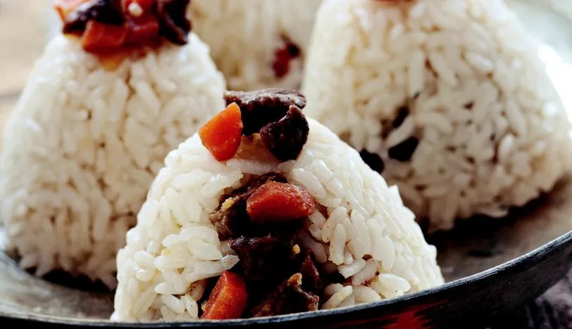 kapların tabanlarına pilav yerleştirin. Üzerlerine etli harcı pay edin. Kalan pilavı üzerine bastırarak koyun. Servis tabağına ters çevirip çıkarın. Arzuya göre, arta kalan etli harcı üzerlerine koyup servis yapın.