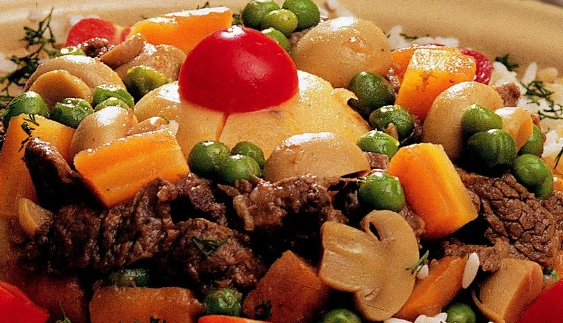 Pirinci ılık tuzlu suda yarım saat bekletin. Pirinci yıkayıp, yarım çay bardağı sıvı yağda şeffaflaşana dek kavurarak bekletin. Bir tencereye sıvı yağı alıp, ısıtın. Eti ekleyip, suyunu bırakıp çekene dek kavurun. Küp doğranmış soğanı ekleyip, pembeleşene dek kavurun. üp doğranmış havucu ekleyip, birkaç kez çevirerek salçayı ilave edin. Yarım dakika daha kavurduktan sonra bezelye, dilimlenmiş mantar ve malzemenin üzerini hafifçe aşacak kadar sıcak suyu, tuz ve karabiberi ekleyin. Ağır ateşte et iyice yumuşayana dek pişirin. Tencereyi ateşten almadan 10 dakika önce soyulmuş ve birkaç yerinden bıçakla delinmiş patatesi bütün olarak tencereye ilave edin. Tencereyi ateşten alın. Isıya dayanıklı bir kasenin orta kısmına patatesi koyun. Üzerine suyunu süzdürdüğünüz kebabı doldurun. İnce kıyılmış dereotunu serpin. Kaseyi ısıya dayanıklı bir fırın kabına ters çevirip bekletin. Pirincin bulunduğu tencereye sıcak su ve tuzu ekleyip, pirinç hafifçe suyunu çekene dek 5 dakika pişirin. Sonra pirinci ateşten alıp, fırın kabındaki kasenin etrafına yayın. Kaseyi alın. Fırın kabının üzerini alüminyum folyo ile kapatıp, önceden ısıtılmış 200 derece fırında pirinç suyunu iyice çekene dek pişirin. Söndürülmüş fırında yarım saat demlendirin. Daha sonra servis yapın.
