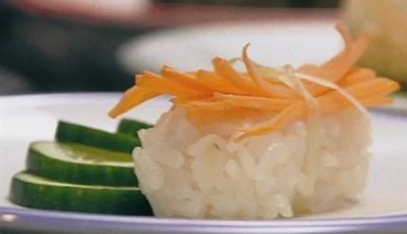 Haşlanmış pirinci avucunuzun içinde yuvarlayarak sıkıştırın. Servis tabağına yerleştirin. Pirincin üst kısmına mayonez sürün. Havucu jülyen dilimleyin. 2-3 dilim havucu mayonezin üzerine oturtun. Pırasanın beyaz kısmından, ince-uzun biçimde kestiğiniz sapla bağlayın.
