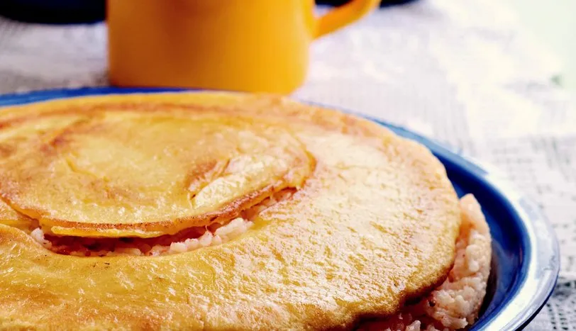 Pilav için pirinci yıkayın. Rendelenmiş domates, tereyağı ve et suyunu tencerede kaynatıp tuz ekleyin. Pirinç ilave edip, kısık ateşte 15 dakika pişirin. Kapak hamuru için, un, su, yumurta ve tuzu boza kıvamı alana kadar çırpıp, krep pişirir gibi tereyağında önlü arkalı kızartın. Hamuru tencereye yerleştirin. Üzerine pilavı koyup, kaşık yardımıyla düzeltin. Ocağa oturtup, kısık ateşte 10 dakika pişirin. Düz servis tabağına ters çevirip çıkarın. Sıcak olarak servis yapın.