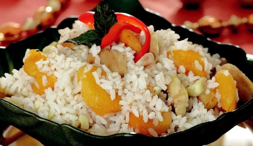 Kayısıları sıcak suda yarım saat bekletin. Kestaneleri haşlayıp kabuklarını soyun. Tereyağını eritip üzerine zeytinyağını ekleyin ve yıkayıp süzdüğünüz pirinci içine atıp 10 dakika kavurun. Pirincin üzerini 1 parmak geçecek kadar sıcak su ekleyin. İkiye böldüğünüz kayısı ve kestaneleri ve tuzu ekledikten sonra 20 dakika pişirin. Altını kapattıktan sonra tarçını serpip üzerine kağıt havlu koyarak demlenmeye bırakın. Nane ile süsleyerek servis yapın.