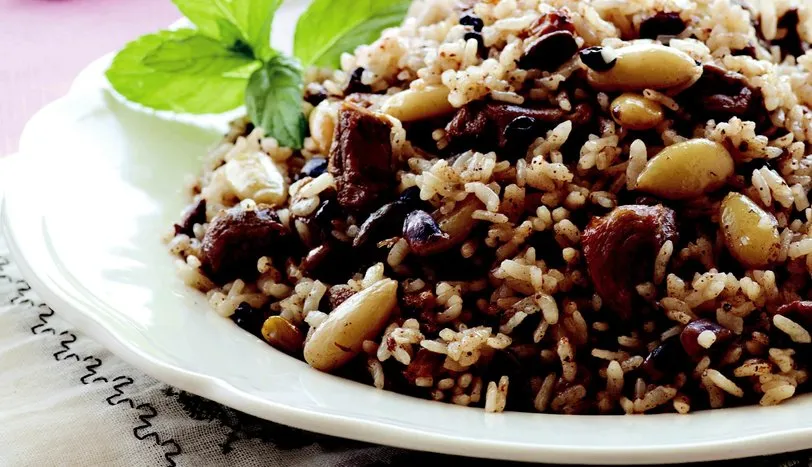 1 PİRİNCİ yıkayıp, tuz eklenmiş ılık suda 1 saat bekletin. Daha sonra süzüp sudan geçirin. Kuşü zümü ve kuru üzümü yarım saat ılık suda bekletin. Kakule tohumlarını havanda dövün. Bademleri kaynayan suya atın ve 5 dakika sonra çıkarıp, kabuklarını soyun. 10 tanesini kenara ayırın.
