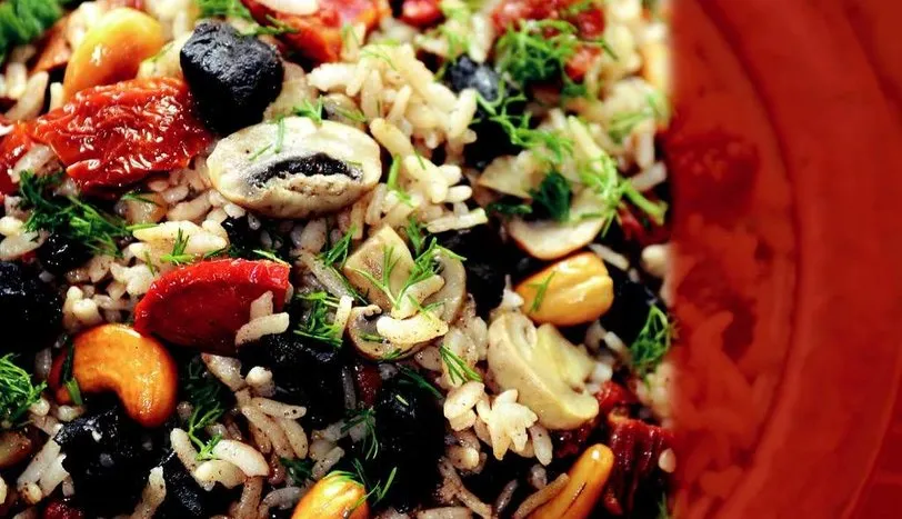 Yüreğin kenar kısımları ve damarlarını iyice ayıklayın. Yıkadıktan sonra kuşbaşı doğrayın. Tereyağını bir tencereye alın ve kızdırın. Yüreği önce harlı daha sonra kısık ateşte suyunu çekene kadar pişirin. Kurutulmuş domatesleri sıcak suda 1 saat bekletin ve kurulayıp, küp şeklinde doğrayın. Ayıklanmış pirinci tuzlu ılık suda yarım saat bekletin ve süzün. İyice yıkadıktan sonra suyunu iyice süzüp, yüreğe katın ve 5 dakika orta ateşte kavurun. Kurutulmuş domatesi ekleyin ve 5 dakika daha kavurun. Dört buçuk su bardağı sıcak su ilave edip, kısık ateşte suyunu çekene kadar pişirin. 20 dakika demlenmeye bırakın. Yapışmaz yüzeyli bir tavada kaju fıstığı hafif pembeleşene kadar kavurun. Demlenen pilava kaju fıstığı, doğranmış mantar, sıcak suda 10 dakika bekletilmiş kuş üzümü, kıyılmış dereotu, tuz ve karabiber ekleyip, karıştırın. Sıcak olarak servis yapın.