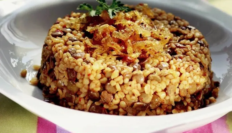 Yeşil mercimeği tencereye alıp, üzerini geçecek kadar sıcak su ilave edin ve haşlayın. Üzerine biber salçası, bulgur ve tuz ekleyin. Pilav suyunu çekip, göz göz olana dek pişirin. Ayrı bir yerde soğanı piyazlık doğrayıp, zeytinyağında pembeleşene kadar kavurun. Pul biber ve karabiber ilave edip, ocaktan alın. Pilavı servis tabağına alın. Kavrulan soğanın yağını kevgirle süzüp, pilavın üzerine gezdirin. Pilavı soğanlarla süsleyip, servis yapın.