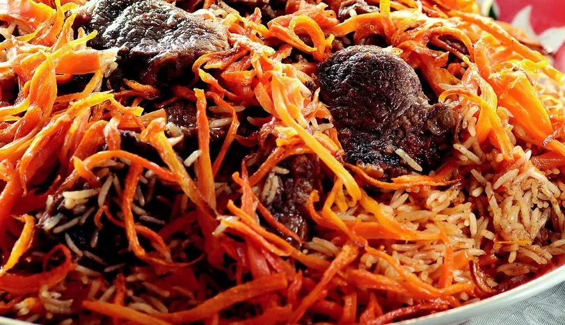 Pirinci ıslatıp kenara alın. Eti sıvı yağda önce harlı ateşte suyunu çekene dek pişirin. Ocağın altını kısıp, 40 dakika daha pişirin. Kıyılmış soğan ekleyip, 20 dakika pişirin. Jülyen doğranmış havuç ilave edip 20 dakika daha pişirmeye devam edin. Pirinci tencereye boşaltıp, ortasını açın. Eti pirincin ortasına yerleştirip, üzerini pirinçle kaplayın. Pirincin üzerini yarım parmak geçecek kadar sıcak suya, tuz-karabiber ekledikten sonra ocağa oturtun ve pişmeye bırakın. Pirinç suyunu çekince ocaktan alın ve demlenmesi için üç yerinden boşluk açıp, 5-10 dakika dinlendirin. Sıcak olarak servis yapın.