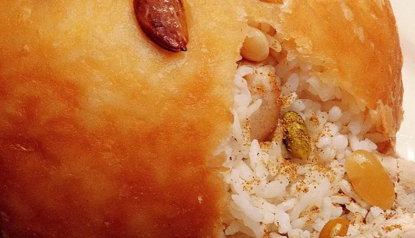 Tavuk göğsünü haşladıktan sonra eti kemiklerinden ayırıp, iri parçalara bölün. Soğanı küp doğrayıp sıvı yağda pembeleştirin. Üzerine yıkanmış 2 su bardağı pirinci ekleyip, şeffaflaşana dek kavurun. 3 su bardağı tavuk suyunu, 1 çorba kaşığı kuş üzümünü ve baharatları tencereye aktarıp, ağır ateşte, pirinçler suyunu çekene dek pişirin. Pilavı ateşten alın. İçine etleri ekleyin. Bademleri ve fıstıkları sıcak suda 5 dakika bekletip, kabuklarını soyun. 2 kaşık sıvı yağda hafifçe pembeleştirin ve pilava ekleyin. Pilavı 10 dakika demlenmeye bırakın. Bu arada 1 yumurtayı, yarım bardak suyu bir kapta çırpın. Tuz ve alabildiğince un ekleyerek kulak memesi yumuşaklığında bir hamur yoğurun. Hamuru unlanmış bir zeminde incecik açın. Yuvarlak tabanlı, ısıya dayanıklı çukur bir kabı margarinle yağlayıp, un serpin. Bademleri bu kaba yerleştirin. Açılan yufkayı serin. Pilavı 1-2 kez karıştırıp, hamurun içine boşaltın. Hamurun kenarlarını pilavın üzerine kapatın. Yufkanın üzerini alüminyum folyo ile kaplayın. Önceden ısıtılmış 220 derece fırında ve fırının alt rafında yufkanın üzeri kızarana dek pişirin. Ters çevirip dilimleyerek sıcak servis yapın.AŞÇININ NOTUBütün tavuk göğsü yerine, tabakta satılan tavuk göğüslerinden iki parça da kullanabilirsiniz.