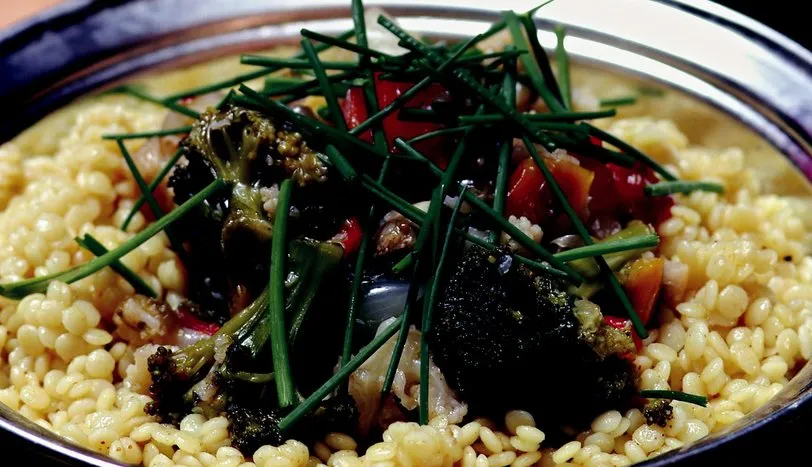 Soğan ve sarımsakları soteledikten sonra, buketlere ayırdığınız brokoli, karnabahar ve diğer sebzeleri az kaynar su ile ekleyin tencereye, pişmeye bırakın. En son tuz ve dileğiniz baharatları ekleyin. Ben bahar koksun istedim, kurutulmuş dereotu, maydanoz ve nane seçtim. Kuskusu az yağ koyduğunuz kaynar suda haşlayın, süzün. Sebze sosunuzla harmanlayın.