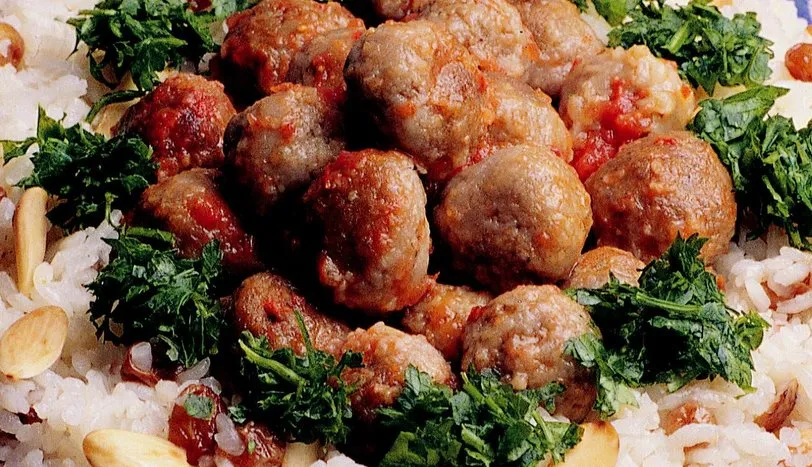 Ön hazırlık olarak pirinci ayıklayıp, bir kaba alın. Üzerini örtecek kadar sıcak su ve tuz ilave edin. Limon suyunu da ekleyin. Soğuyana dek pirinci suda bekletin. Ardından pirinci birkaç kez nişastası gidene dek yıkayın. Suyunu süzün. Tencereye tereyağını alıp, eritin. Bademleri ilave edip, 1 dakika kavurun.Bademler hafifçe pembeleştiğinde pirinci tencereye aktarın. Karıştırmaya devam ederek, pirincin şeffaflaşmasını sağlayın. Tavuk suyun tabletini, 3 su bardağı sıcak suda eritip, kuru üzümle birlikte pirincin üzerine ekleyin. Tuzunu ayarlayın. Birkaç kez karıştırdıktan sonra tencerenin kapağını kapatın. Pilavı suyu çekip üzeri göz göz olana dek pişirin. Tencereyi ateşten aldıktan sonra üzerine nemli bir bez örtün. Kapağını kapatıp, 15-20 dakika demlendirin. Köfte için, kıymayı geniş bir kaba alın.Ekmek içini, rendelenmiş soğanı, tuzu, karabiberi ve kimyonu ilave edin. Malzemeler özleşene dek yoğurun.Misket iriliğinde köfteler hazırlayın ve kızartın. Domateslerin kabuklarını soyup, fındık iriliğinde doğrayın. Tavaya aktarın. Tavayı sallayarak, domateslerin yumuşamasını sağlayın. 1-2 çorba kaşığı su ilave edin. 5 dakika daha pişirip, ateşten alın. Pilavı servis tabağına alın. Ortasını çukur şekilde açın. Köfteleri pilavın ortasına yerleştirin. Domates sosu ile birlikte servis yapın.