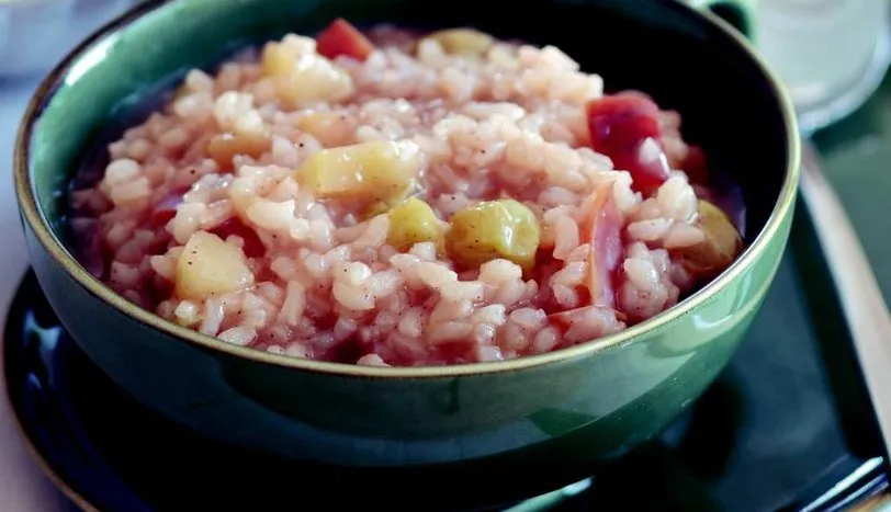 Esmer şeker ve tereyağını tencereye alıp, orta ateşte kavurun. Küp doğranmış elmayı, üzümle birlikte kavurun ve tencereye ilave edin. Ayrı bir yerde pirinç ve tarçını 2-3 dakika kavurup, tencereye alın. Masalayı ekleyin. Elma suyunu ilave edip, suyunu çekene dek karıştırın. Ocağın ısısını yükseltin. Tuzunu ayarlayıp, su ilave edin. Hafif sulu kıvamlı kalana dek pişirin. Sıcak olarak servis yapın.