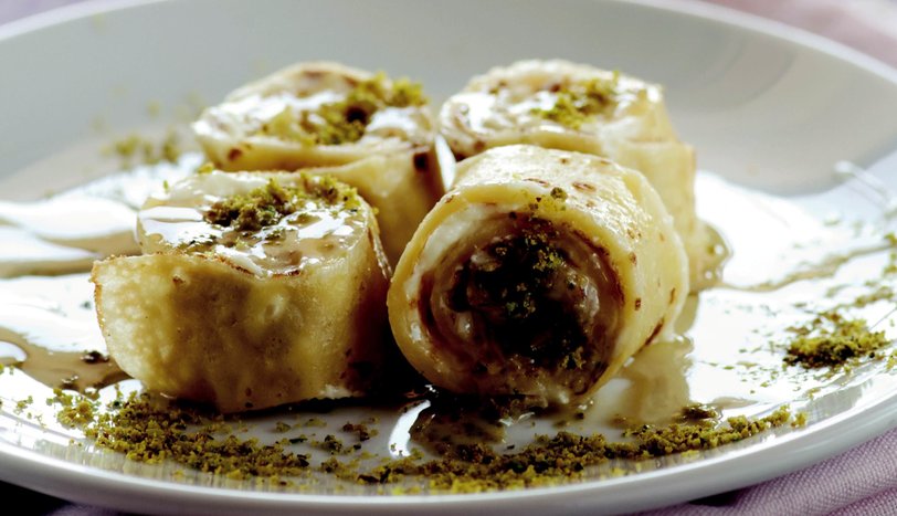 Önlü arkalı pişirip tavadan alın. Kalan harcı 3 adet krep çıkacak şekilde pay edip, aynı şekilde pişirin. Ilınan kreplerden bir adedini düz bir zemine serin. Üzerine kaymak sürün. Rulo şeklinde sarın ve dilimleyerek servis tabağına alın. Üzerine bal ve tahin gezdirin. Antep fıstığı serpin. Kalan krepleri de aynı şekilde hazırlayıp servis yapın.