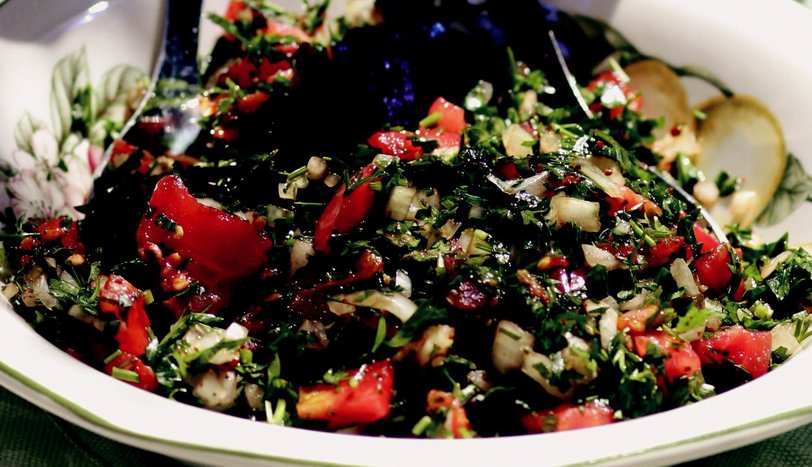 İnce kıyılmış soğanları derin bir kaba alın. 1 çay kaşığı tuz ve sumak ile iyice ovun. Kıyılmış maydanozu ve kabuklarını temizleyip küçük doğranmış domatesleri ekleyin. Pul biberi, 1 çay kaşığı tuzu, zeytinyağını, nar ekşisini ve limon suyunu ilave ederek iyice karıştırın. Salata kasesine alıp, servis yapın.