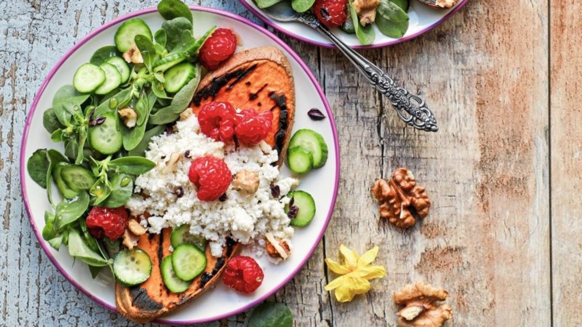 Izgara patates dilimlerini tabaklara alıp üzerlerine lor peyniri ve ahududuları paylaştırın. Yanlarına semizotu, ceviz ve salatalık dilimlerini koyun.