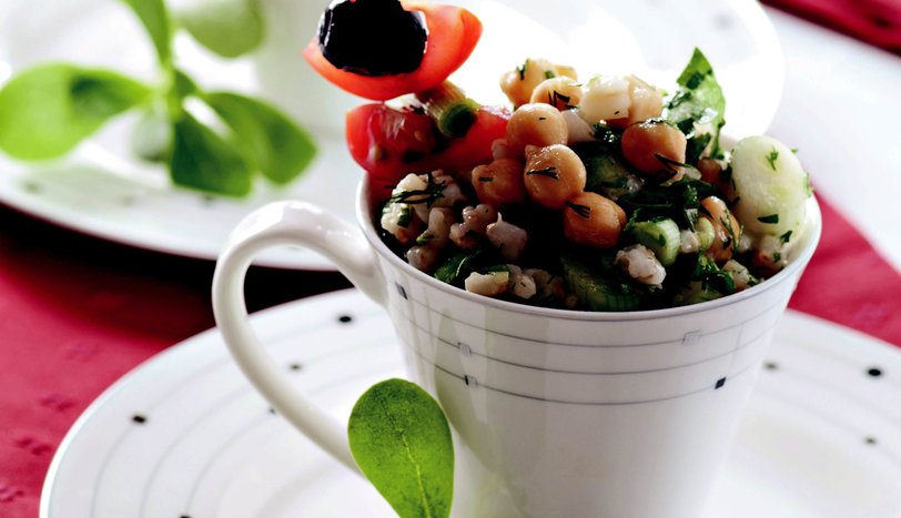 Derin bir kapta nohut, buğday, kıyılmış taze soğan, piyazlık doğranmış kırmızı soğan, kıyılmış dereotu ve naneyi harmanlayın. Tuzunu ayarlayıp servis tabağına alın.